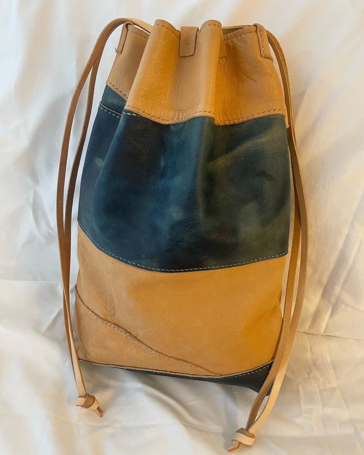 肉の副産物として生まれた革を無駄にせず、丁寧に鞣し、藍染めや季節の色で島の景色を映し出します。